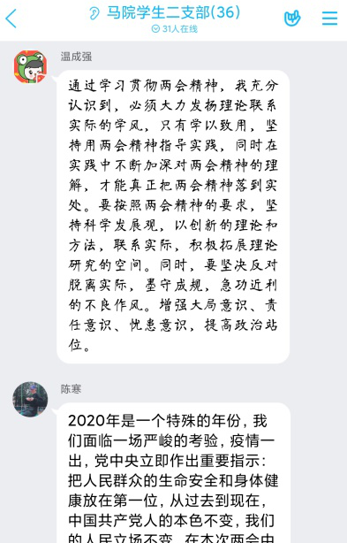 学生二支部委员会利用网络平台组织召开了支部大会,大会以学习《政府工作报告》、《全国人民代表大会关于建立健全香港特别行政区维护国家安全的法律制度和执行机制的决定(草案)》、常态化疫情防控下重要举措,并交流讨论学习心得为主要内容。