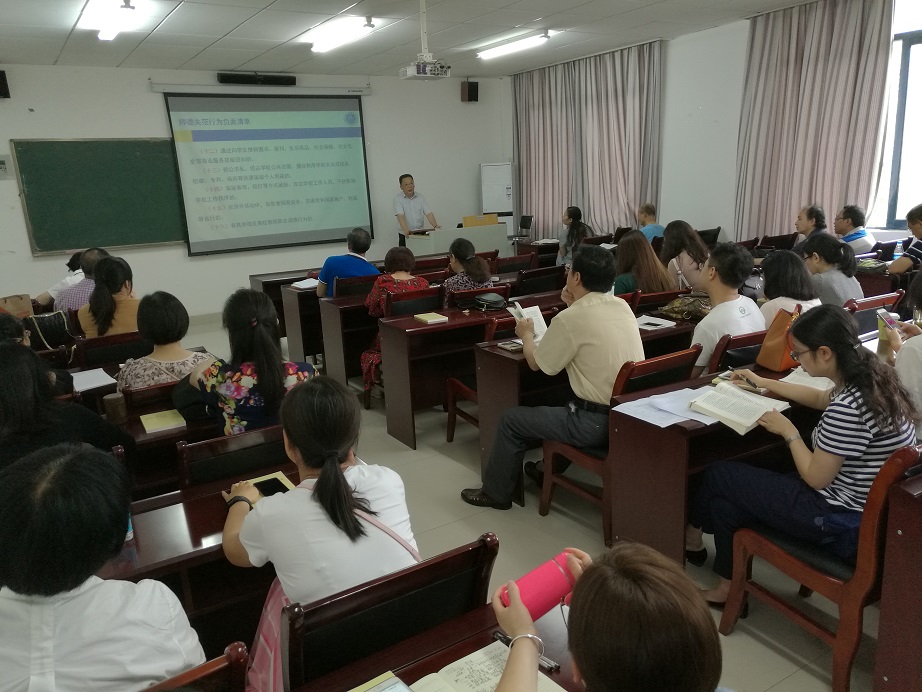 为深入贯彻学校师德师风建设专题会议精神,进一步加强学院师德师风建设,教育引导学院教职工以德立身、以德立学、以德施教、以德育德,争做“四有”好老师,提高“立德树人”成效,2019年6月20日下午,学院在汇贤楼201会议室组织全院教职工进行了师德师风专题教育。专题教育学习活动由院长陈洪教授主讲。