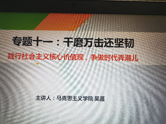 吴涯副教授主讲,讲课主题为“践行社会主义核心价值观,争做时代弄潮儿”。本次授课采用了QQ群课堂的线上教学形式,选课同学按时、全部参与了此次线上教学活动。