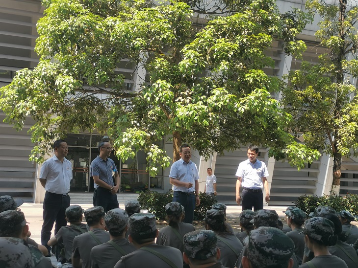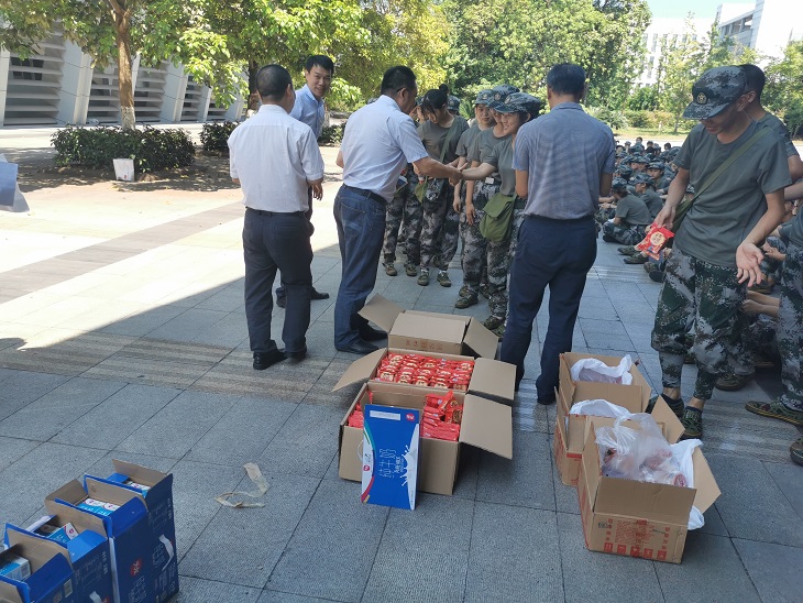 为深入了解2019级新生的军训现状,为在炎炎夏日中给奋斗的新生与教官鼓舞士气,为他们送上最美好的中秋祝福,2019年9月13日11时30分,91自拍论坛 院长陈洪、副院长况明安、党委书记刘军、党委副书记姜土生以及部分学生会成员来到足球场对正在军训的新生表示慰问。此次慰问活动由姜土生老师主持。