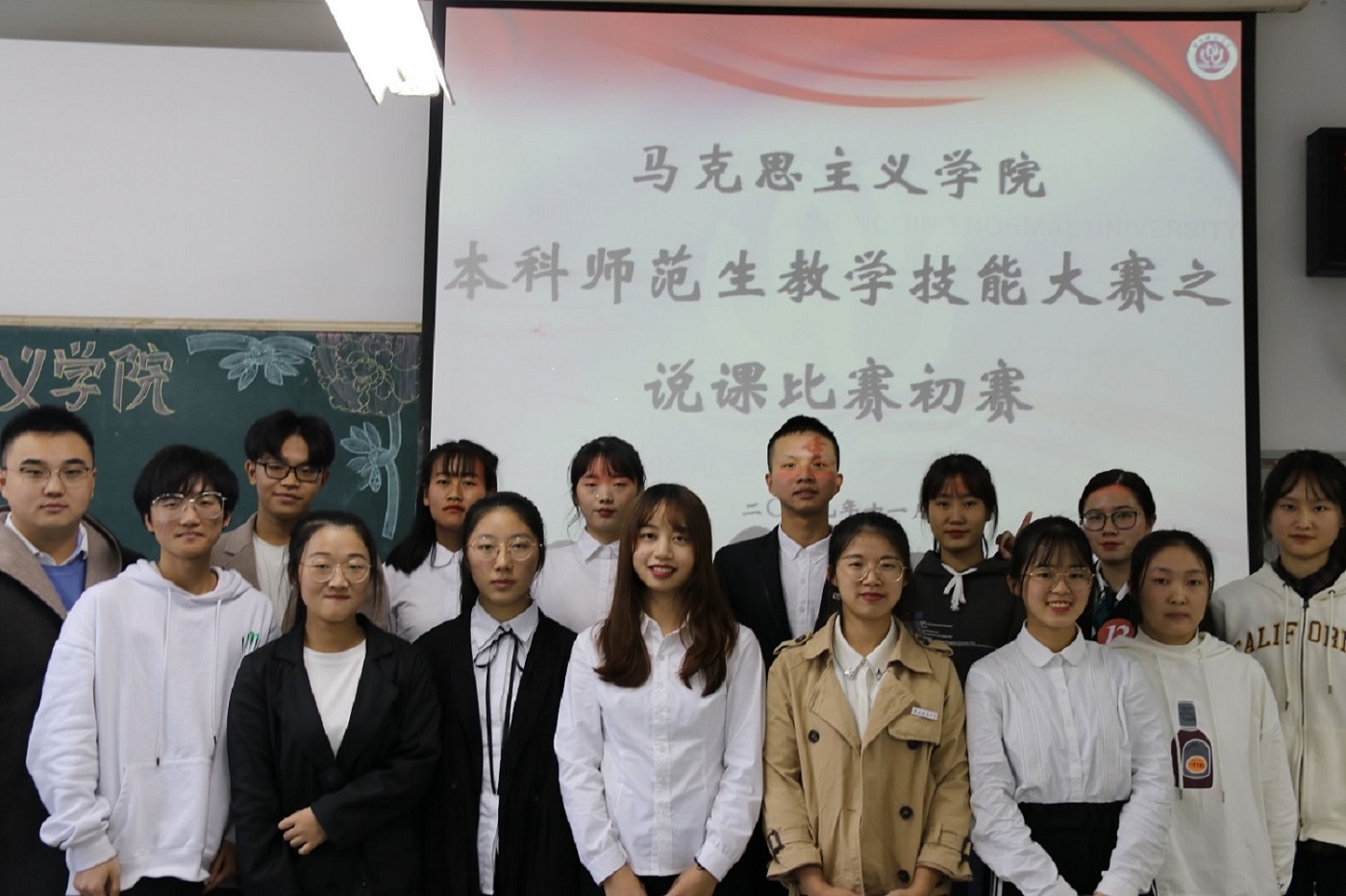 活动伊始,主持人介绍了出席本次活动的嘉宾并宣读比赛规则。本次比赛由选手比赛、公布名单、嘉宾点评、合影留恋四个环节构成。此次比赛,选手们选题丰富,形式新颖多样。在各自短暂的十分钟说课时间里,参赛选手们动作自然得体,清晰明了的围绕说教材、说学情到说教学过程与理念等方面地对说课课题进行了绘声绘色地讲解,言行举止间洋溢着积极向上的精神面貌,充分展现出了一名预备思政课教师的风采。其中17级赛场上的2号选手深刻把握说课课题,以谜语的方式导入,引出教学课程,增强了说课趣味性。更令人眼前一亮的是,她巧妙结合中国特色社会主义的四个自信中的“文化自信”进行情感升华,教学目标成效显著,获得现场评委的一致赞赏。