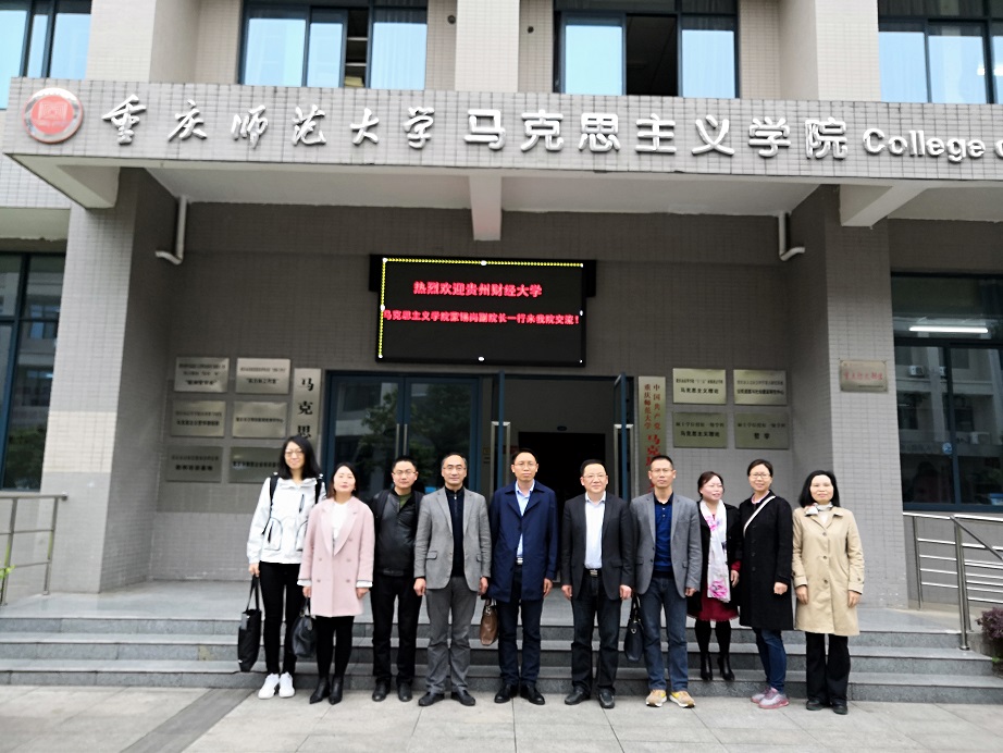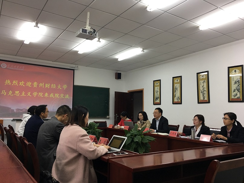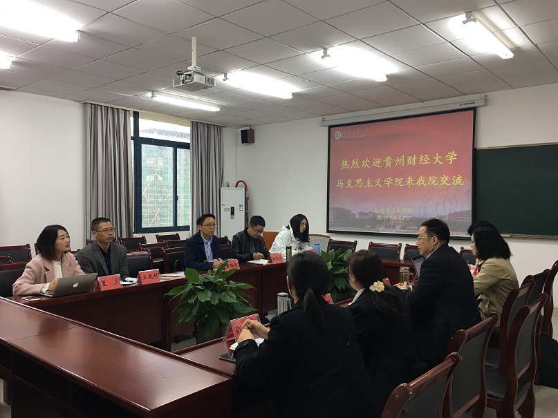 2019年4月2日上午,贵州财经大学91自拍论坛 蒙锡岗副院长一行来91自拍论坛 进行交流。91自拍论坛 党委书记刘军、院长陈洪,思想政治理论课教研部主任孔庆茵、副主任魏冰娥,毛中特教研室主任邵二辉,《高校思想政治理论课实践教学实用教程》主编陈钢,教科办主任张晓庆参加交流。