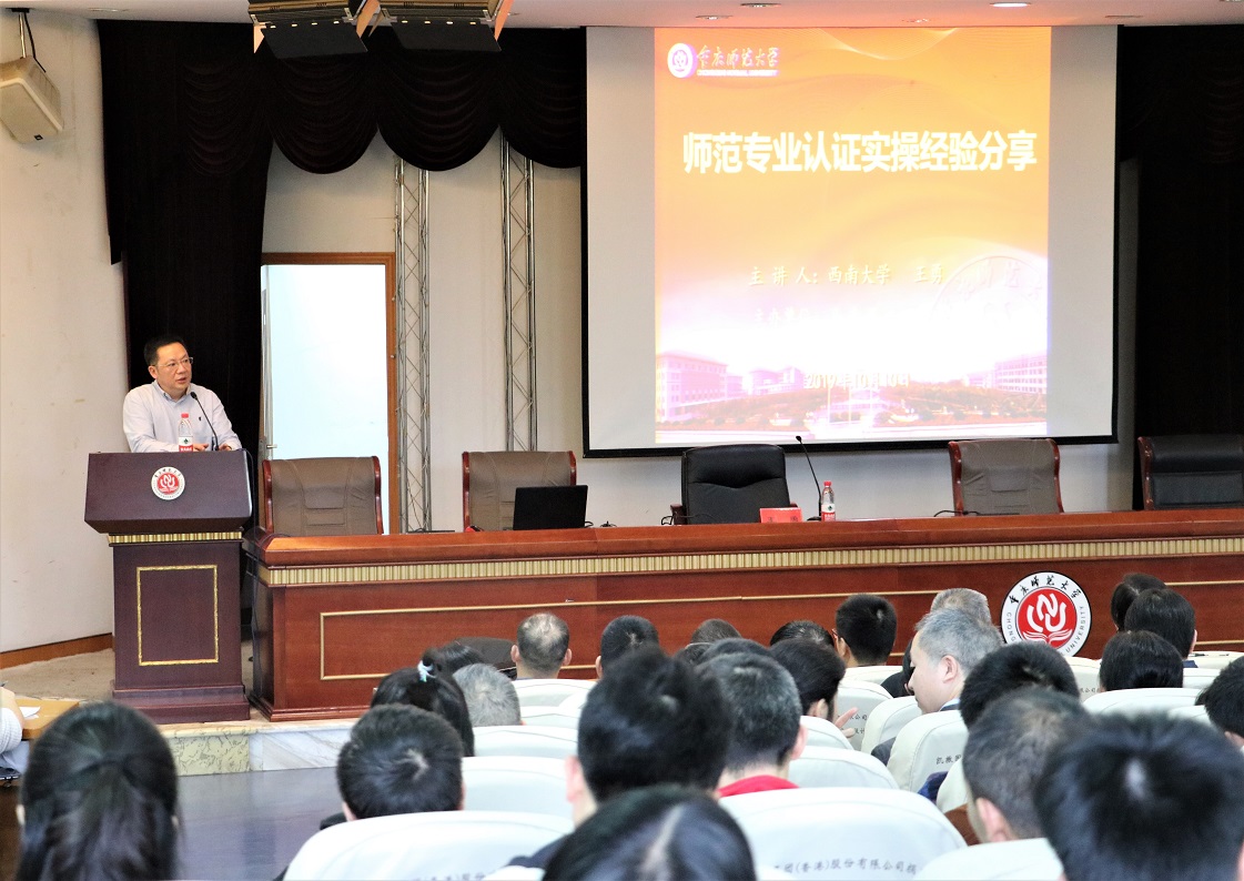 2019年10月10日下午,教育部师范专业认证专家、西南大学地理科学学院副院长王勇博士做客我,在弘德楼凯撒报告厅作了题为“师范专业认证实操经验分享”的讲座。院全体教师及部分学生聆听本次讲座讲座由学院院长陈洪教授主持。