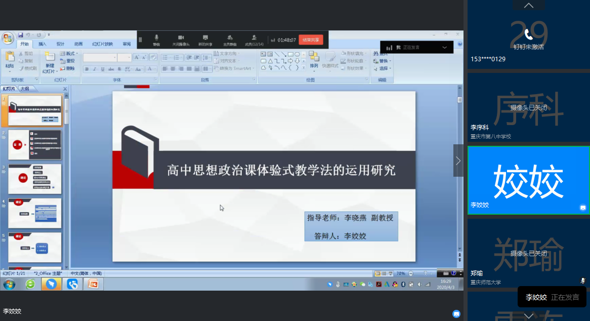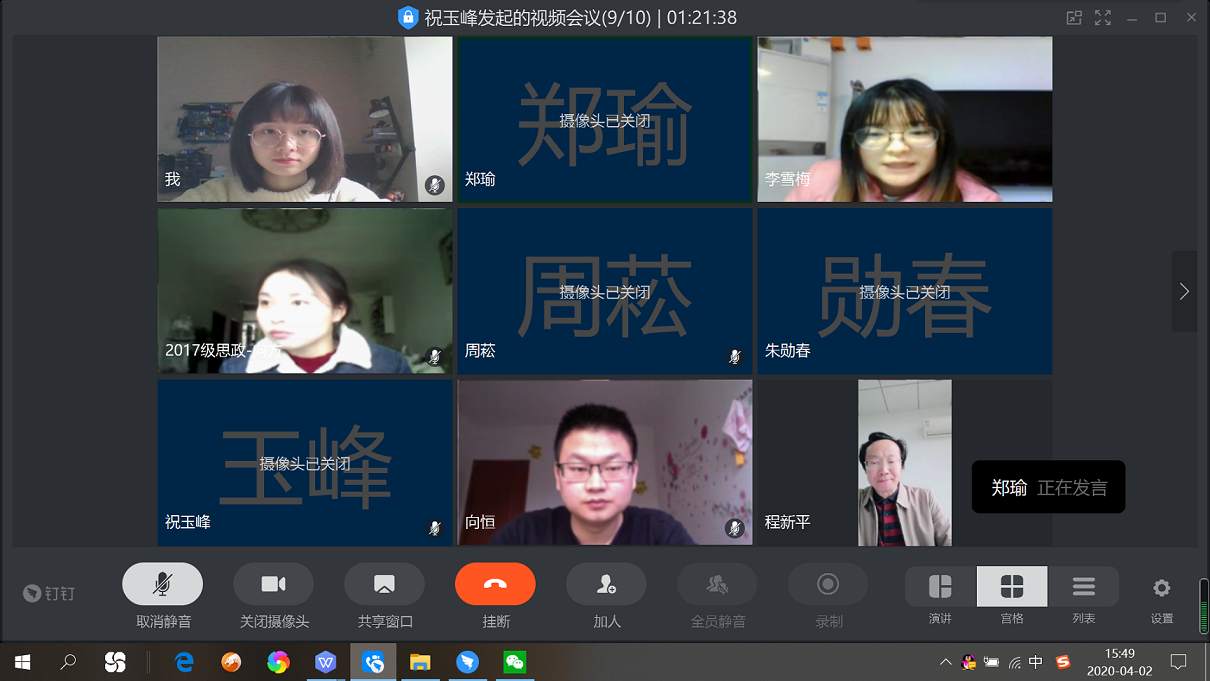 目前正值新冠肺炎疫情特殊时期,为加强对毕业研究生学位论文的指导和管理,切实提高研究生培养质量,学院认真贯彻落实教育部和学校工作要求,切实担起责任,努力做到研究生学位论文与学位授予工作质量不降、标准不变、程序规范、方式便利。根据学校的要求和学院的安排,2020年4月2日、3日下午,我院采取钉钉视频会议的形式分别开展了2020届马克思主义理论、哲学学科学术型研究生和学科(思政)专业学位研究生学位论文线上预答辩工作。