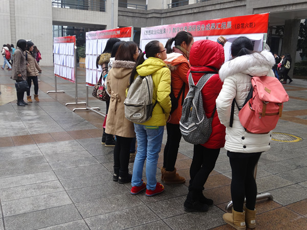“思想政治理论课实践教学优秀调研报告汇报展”(总第六期)在弘德楼中庭隆重举行。本次展出的调研报告,是从我校2012级历史与社会学院、文学院、外语学院、生命科学学院、化学学院、物理与电子工程学院、计算机与信息科学学院的同学们在历时半年的实践教学活动中产生的调研报告中遴选出来的部分优秀作品,共计81篇。同时还展出了同学们在参加社会实践活动过程中的图片资料。