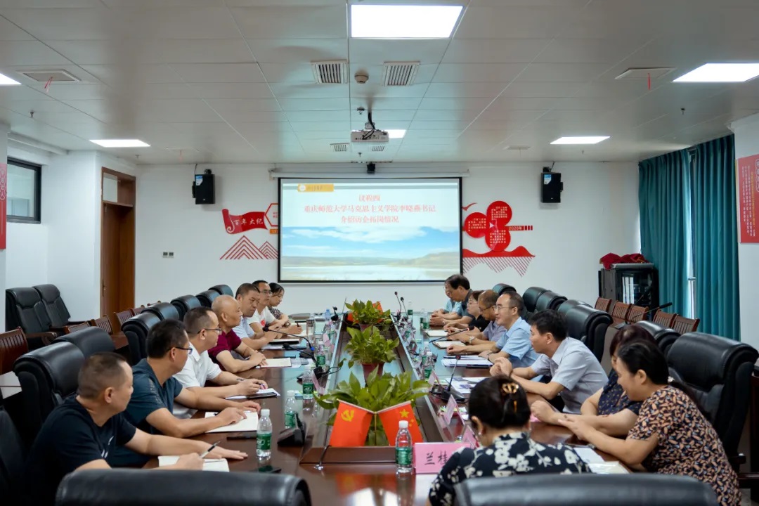 党委书记李晓燕、执行院长姜土生、副院长田方林、思政课教研部主任孔庆茵、思政课教研部副主任兰桂萍、政教系主任左秋明、政教系副主任郑瑜与王建斌、办公室主任廖文梅一行九人赴西华师范大学91自拍论坛