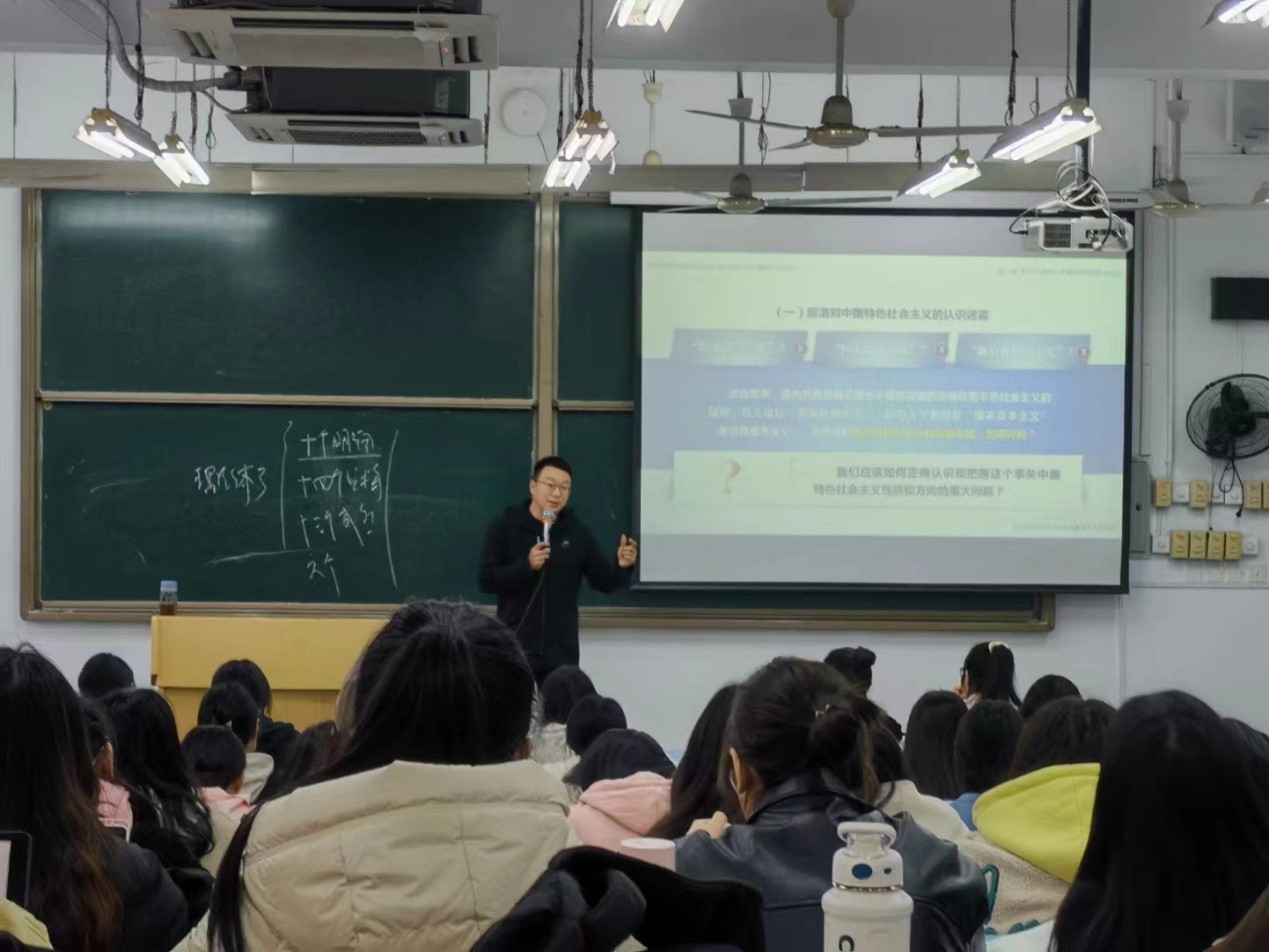 蒋明伟老师以“中国特色社会主义是社会主义而不是其他主义”作为教学内容,以问题为导向引入新课。课堂中蒋明伟老师以师生互动讨论为主要教学方式,理清和批判了西方的错误论断,廓清认识迷雾,阐明了中国特色社会主义不是其他主义,进而以坚持科学社会主义基本原则确证了中国特色社会主义是社会主义。蒋明伟老师以饱满的激情,以新时代雄辩的成就,阐明中国特色社会主义如何书写了科学社会主义的“新版本”,如何开创了人类文明新形态。