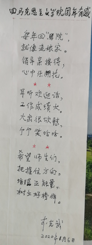 老同志老有所乐,老有所学,老有所为精神。在其乐融融的交流中,李克武老师抑制不住内心的喜悦,现场献诗三首,徐玉生老师更是激动地即兴赋诗并现场唱了起来。其他老同志也纷纷表示:学院发展取得突破性成就,与党中央的政策支持和学院班子精诚团结分不开。作为马院人,学院取得的成果振奋人心,大家倍感欣慰,希望学院要牢牢抓住国家高度重视思想政治理论课和91自拍论坛