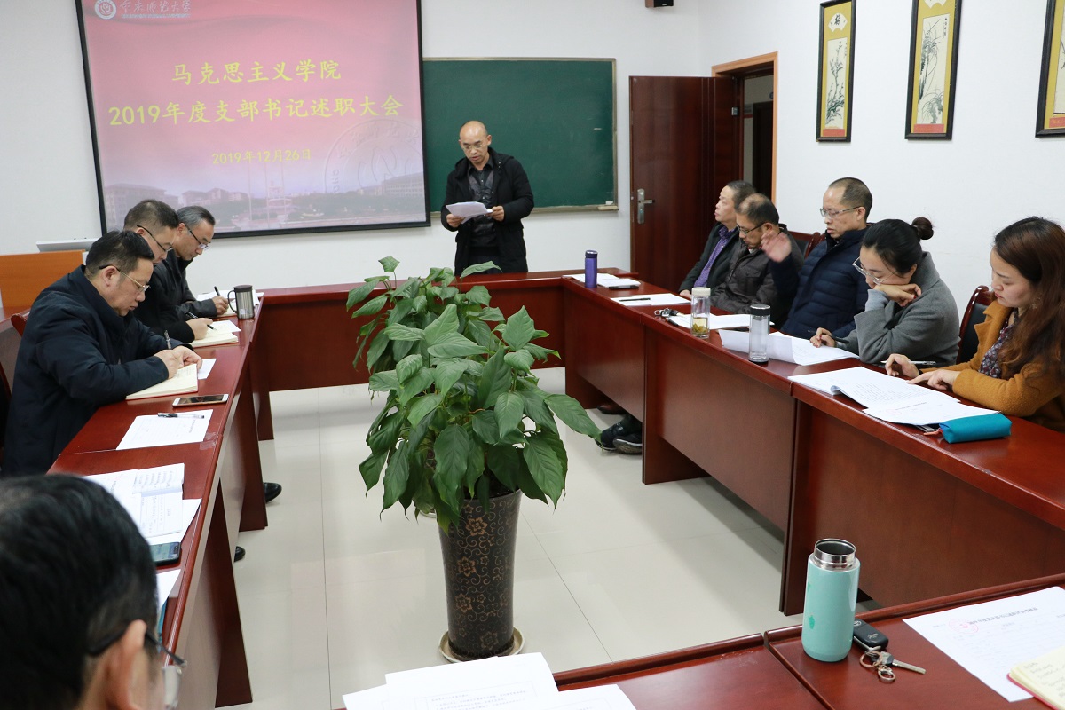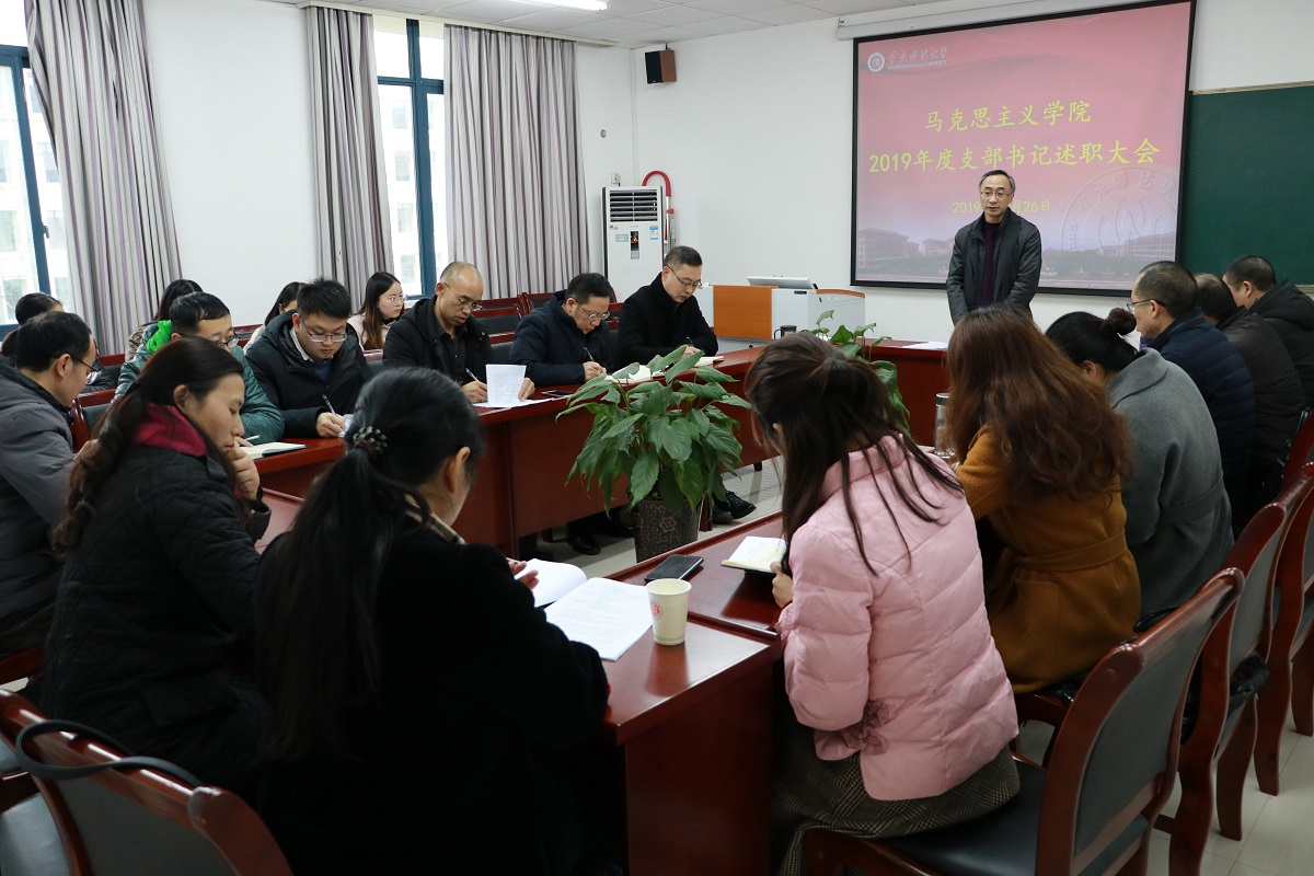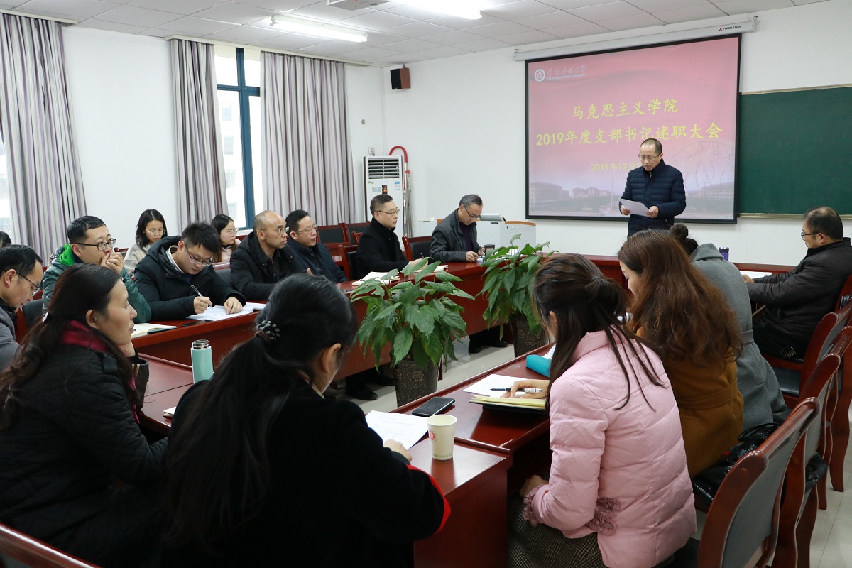述职开始前,刘军书记传达了2019年度党建工作考核的文件精神,并对年终考核的重要性作了强调。紧接着,马基原党支部、毛中特党支部、纲要与行政党支部、思法党支部、研究生党支部、学生一支部、学生二支部的支部书记(或代理书记)就2019年度的履职情况、存在的突出问题及下一步打算措施三个方面向学院党委做了汇报。通过“不忘初心、牢记使命”主题教育第一阶段的学习以及对支部委员会的问题检视,各支部表示在接下来的工作中将切实展开整改。教师支部结合思想政治理论课教师工作性质和特点,将支部工作在“党员教师先锋课堂” 建设中得到升华。