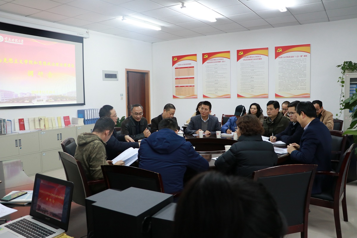 和思想政治理论课建设”现场调研座谈会,陪同曾礼书记一起调研的学校职能部门负责人有党委宣传部部长(学校思想政治理论课建设领导小组办公室主任)毛宇、教务处处长申仁洪、党政办副主任王军、财务处副处长李碧宏、资产管理中心科长王睿。马克思主义院党委书记刘军、院长陈洪、副院长况明安以及学院科级干部、系部负责人、教代会及工会代表、支部书记代表、教师代表、辅导员代表等参加了调研会。