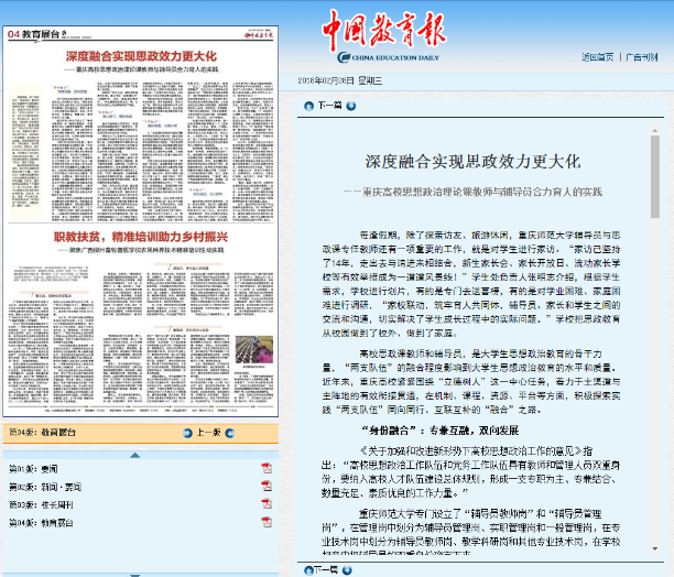 2018年2月28日《中国教育报》04版刊发文章《深度融合实现思政效力最大化——重庆高校思想政治理论课教师与辅导员合力育人的实践》,其中深入报道了91自拍论坛