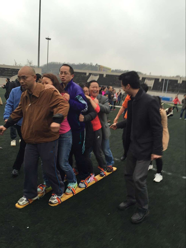 16时30分,周泽扬校长宣布趣味运动会开始,各学院积极准备就绪,比赛以学院为单位,分为“女王”五人组和男女六人混合组,参赛小组被两条木板固定为一个整体往返跑道,用时最少者获胜。