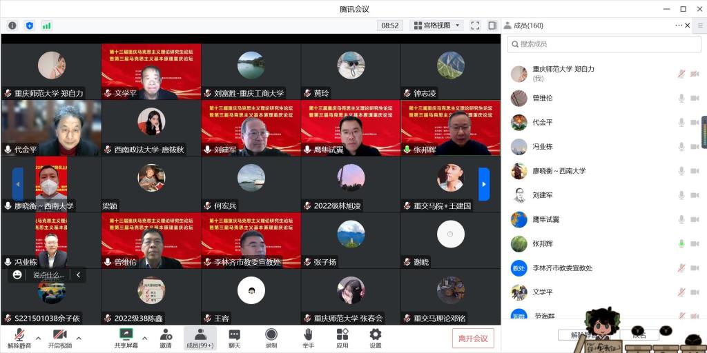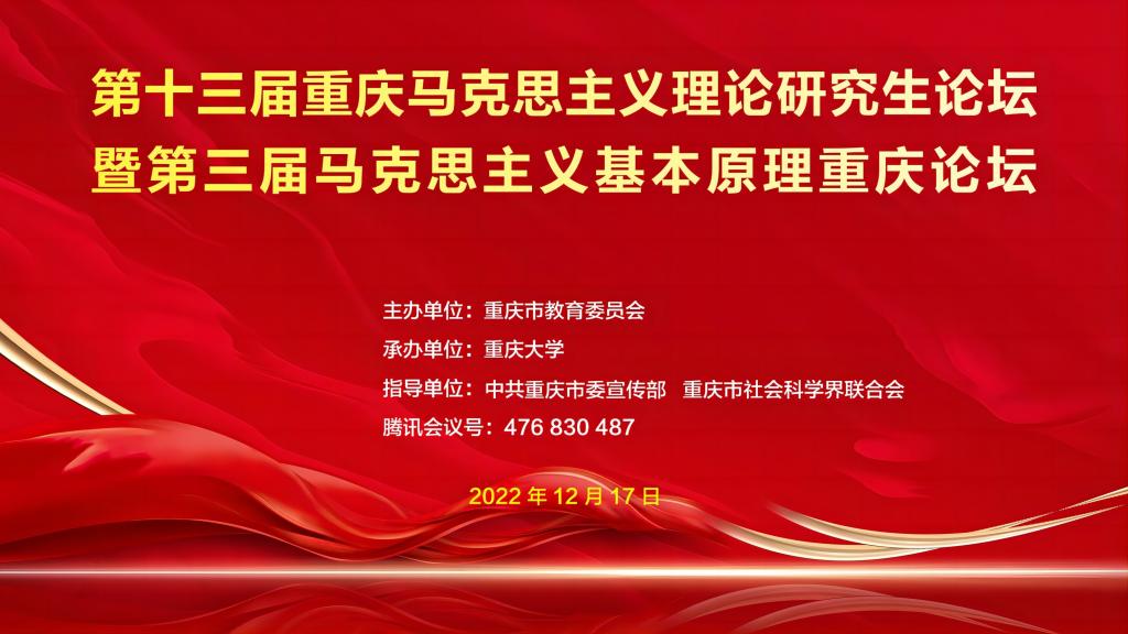 为进一步深入学习宣传贯彻党的二十大精神,提升市内高校马克思主义学科研究生科研水平。2022年12月17日8:30,由重庆市教委主办,重庆大学承办的第十三届重庆马克思主义理论研究生论坛暨第三届马克思主义基本原理重庆论坛以线上方式顺利举行。