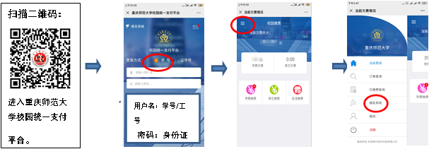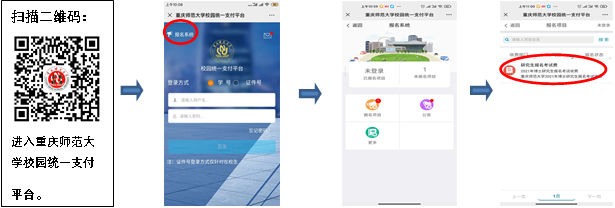校内考生扫描二维码用学号登录报名系统,选择报名项目后即可报名缴费;校外考生扫描二维码进入报名系统,选择报名项目后需先注册后再报名缴费。