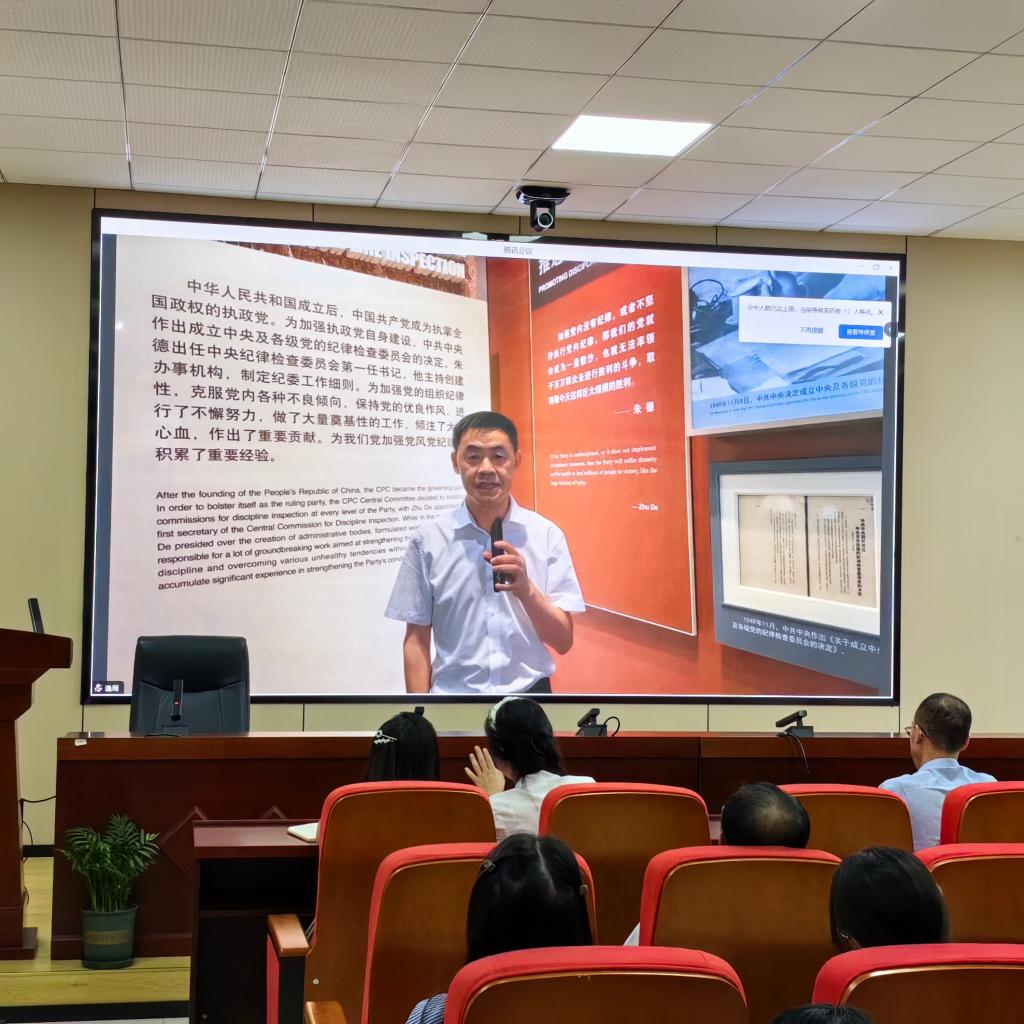 本次培训的主题是《党史中的纪律教育——朱德与党风廉政建设》。培训地点一是朱德同志故居纪念馆,地点二是学院106报告厅,通过采用数字化技术手段,全院师生党员、新发展的入党积极分子、发展对象远程聆听胡润局长在朱德同志故居纪念馆给大家带来的现场讲解。胡润同志围绕朱德同志为什么出任中央纪委书记、朱德同志为党的纪律检查工作所做的贡献、对现行的党纪学习教育带来的启示三个方面结合纪念馆内的展呈进行讲解。他讲到,朱德同志在担任中央纪委书记的五年多时间里为加强党的纪检建设倾注了大量心血,为从纪律上保持党的先进性和纯洁性作了重大贡献。在这五年多时间里,纪检系统在他的带领下处理了近30万起案件,系统地、充分有力地向党内违法乱纪的现象进行了斗争,为加强党的纪律建设,克服党内各种不良倾向,保持党的优良作风起了很好的警示作用。此外,胡润局长引领与会人员深入学习了习近平总书记在纪念朱德同志诞辰130周年座谈会上发表的重要讲话精神,他表示,朱德同志在纪律检查工作实践中所形成的有关党纪检建设的理论具有很强的创造性、前瞻性和实践性,对新时代加强党风廉政建设和纪律检查工作有着非常重要的理论指导意义。