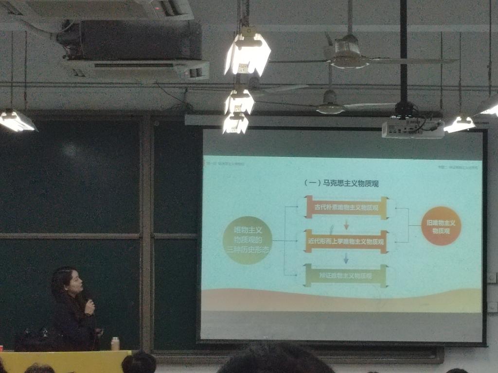 此次教学展示活动随堂进行。李洪淑老师为数学科学学院2022级应用数学专业同学讲授马克思主义的物质观、运动与时空观。李老师给同学们讲了芝诺的哲学思考——“飞矢不动”,通过这个生动形象的反常识命题作为课程导入,调动起同学们的好奇心和兴趣,整个课堂充满了吸引力和活力。教学活动中还穿插了线上线下教学互动环节,通过设置“人一次也不能踏进同一条河”和“人两次也不能踏进同一条河”的线上教学抢答,即时监测了同学们的学习领悟情况。整个讲授过程逻辑清晰、重点突出、分析透彻,注重引导学生思考,注重与现实相结合启发学生,教学设计中还特别注重提升学生主动性和参与性。比如通过提出问题,让学生自主思考、寻找答案后积极争取限量的回答问题的机会。学生在课堂上非常积极、活跃,参与度高。授课中,李老师的脸上始终洋溢着热情的笑容,让学生倍感亲切,整个课堂氛围很好。