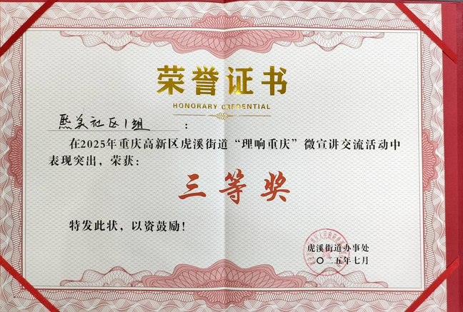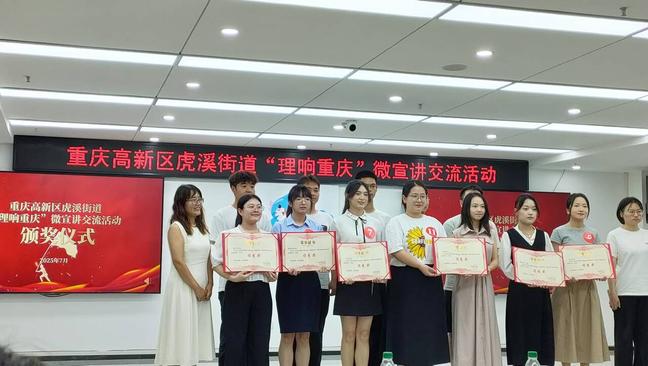 “概论”教研室党支部组织并指导学院王铭椰、吴诗琦、陈倩等6位研究生,经过一个月多的理论内容建构打磨、材料收集选择、宣讲能力培训提升等准备工作,两支微宣讲队伍结合熙美社区文化建设实际和重庆作为西部大开发战略支点,以透彻的理论分析、丰富的实际材料、富有感染力的语言,于2025年7月16日在重庆市高新区虎溪街道6楼会议室参加微宣讲交流活动,获得三等奖和优秀奖的成绩。