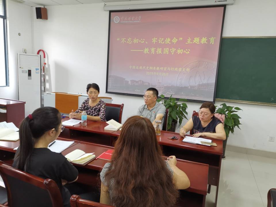 首先,全体党员一起观看了视频《习近平总书记在“不忘初心、牢记使命”主题教育工作会议上的讲话(2019年5月31日)》。其次,陈洪、周秀红二位同志围绕教育报国守初心发表了自己的心得体会。陈洪同志表示,近段时间以来学习了习近平总书记的重要讲话精神,重温周恩来、刘少奇、朱德、陈云等老革命家的生平事迹,通过对照党员的八项义务、六项标准,自己还要认认真真研读党章、党史,研读习近平总书记最新思想,督促自己,强化党员意识,做好本职工作,严守党的纪律和规矩。周秀红同志表示她的初心就是当一名老师,为学生传道授业解惑,并回顾了她同为教师的母亲在她的成长路上对她潜移默化的影响,她把她的大学老师送她的话“千教万教教人求真,千学万学学做真人”牢记于心,并始终贯穿在了她的工作生活中。第三,由高德华同志领学,大家共同学习《中国共产党纪律处分条例》。第四,根据今天学习的内容,大家展开讨论进行对照检查。其中大家都对和谐问题产生了共鸣,一致表示,家和万事兴,小到支部,大到学院都是我们共同的家,在家里有问题提,有问题改,让学院这个大家庭风清气正、和谐向前发展。