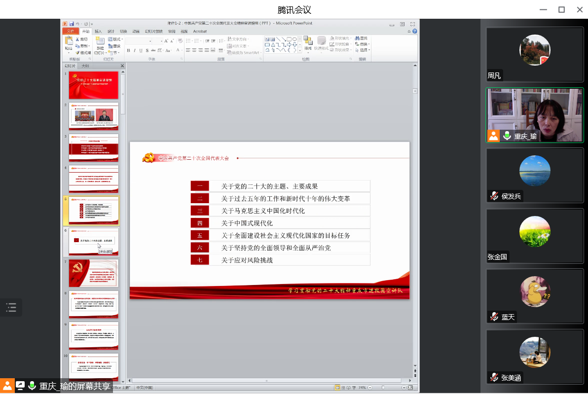 随后,支部成员进行了踊跃的交流发言。肖陆军同志按照二十大报告提出的大力发展社会主义先进文化的要求,聚焦新时代更好弘扬革命文化,从革命文化的内涵、加强党的领导、推进革命文化的治理体系创新等方面介绍了自己的研究成果;许珊珊同志着重谈了对中国式现代化本质要求的理解,并以一系列翔实的数据,从产业结构调整、城乡协调发展以及绿色发展等方面介绍了十八大以来我国经济高质量发展的具体成就。