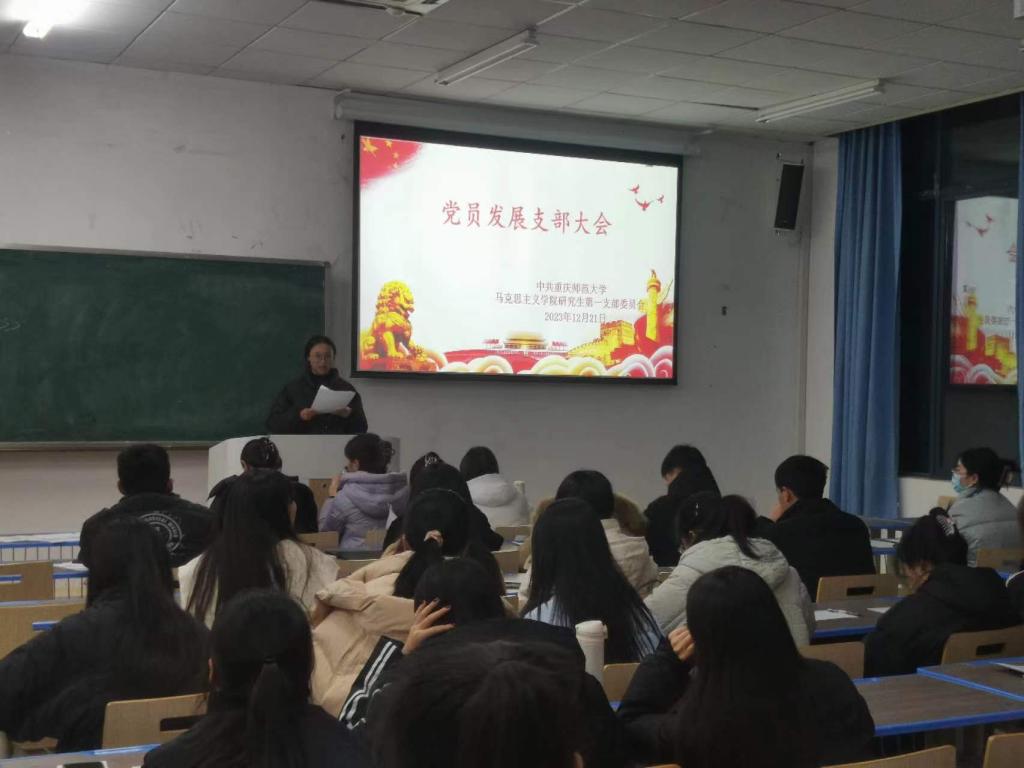 2023年12月21日下午18:30,学院研究生第一支部于汇贤楼X102教室召开“支部书记上党课暨党员发展支部大会”,会议由支部书记李剑同志主持,共两项议程。