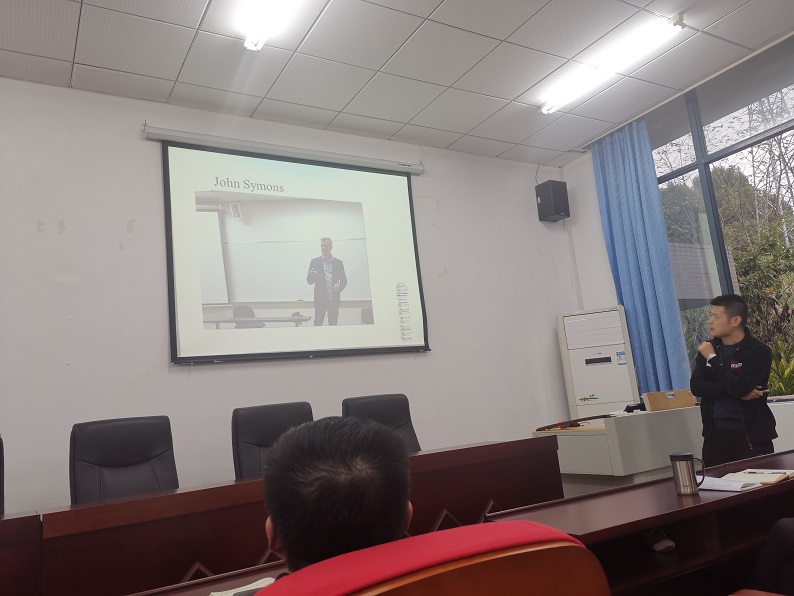 接着,基地成员黄正老师以他的美国之行的照片引出话题,并以生动多样的图片带领大家走进他的访学之旅。黄老师从他访学城市的发展状况、访学学校的建设情况、学院学科专业的基本情况以及他访学的学习状况四个方面进行了分享,强调了其访学单位在文献学习、作业布置和课程讲授等诸多方面的授课形式和方法值得大家借鉴。
