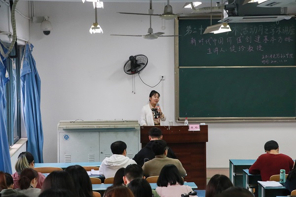 侯玲教授从创建新时代“中国价值”基本方略的必要性、当前中国社会价值观的基本状况与价值观转型的发展趋势以及创建“中国价值”的基本方略三方面为同学们阐述新时代“中国价值”创建的基本方略。其中,侯教授强调文明的冲突是创建新时代“中国价值”的焦点。接着,还强调要建立以“我”为主的“创建论”,要立足现实,以实践为原动力,以“向前看”为取向,在人类一切优秀文化成果基础上,创建“中国价值”,即中国特色社会主义核心价值观。