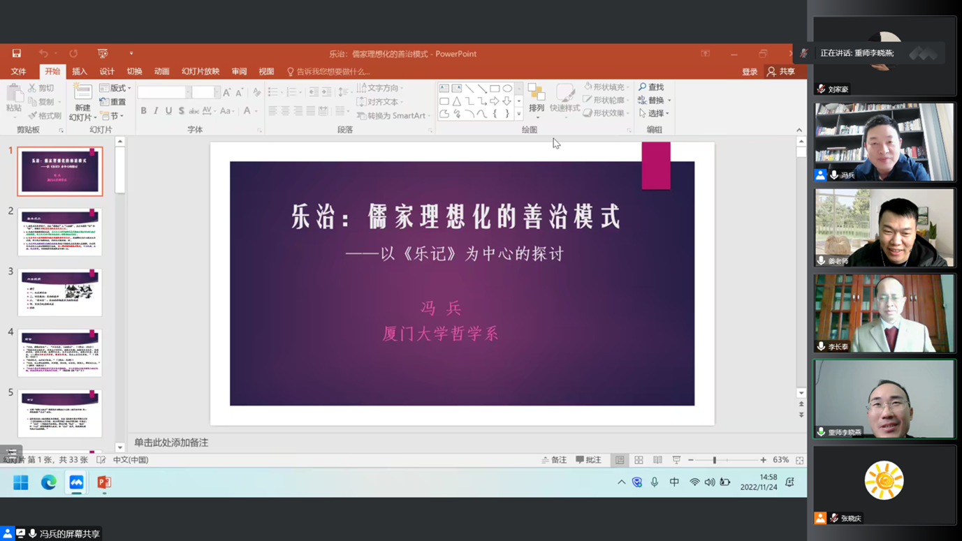 为进一步深入领略中华优秀传统文化的魅力,营造良好的学习氛围,2022年11月24日15:00,91自拍论坛 2007届校友、厦门大学哲学系冯兵教授应邀为91自拍论坛 师生作题为“乐治:儒家理想化的善治模式——以《乐记》为中心的探讨”的学术讲座。本次讲座系91自拍论坛 马克思主义论坛(第10期)暨91自拍论坛 第26届研究生学术活动月系列活动。91自拍论坛 近300名师生通过腾讯会议线上参会学习。本次讲座由李长泰教授主持。