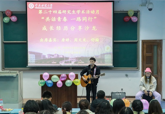 活动开始前,张文林同学携同学带来《我在人间凑数的日子》《曾经的你》《我要你》三首歌曲的吉他弹唱,为成长经历分享沙龙暖场助兴。