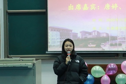 第一位分享者唐婷开启了“共话青春 一路同行”成长经历分享的话题。唐婷用轻松、幽默的语言分享了她在考研阶段的学习经历和上班的工作经历,根据自身的经验传授给同学们学习和工作的小技巧,并以自身热爱运动的事例鼓励同学们兼顾学习和运动,做更好的自己。接着,研究生代表带来朗诵《重生,我的国》,同学的朗诵铿锵有力,为成长经历分享沙龙添彩。