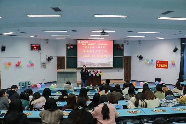 2018级唐婷、2019级周文龙以及2020级舒瀚三位研究生分享他们的成长经历。2019级学术班研究生和2020级全体研究生参加此次活动,活动由罗滢滢和白佳惠同学主持。