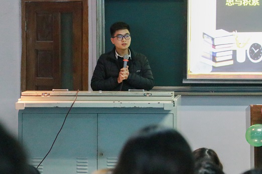 第二位分享者周文龙以“新教师成长之路”为题分享了他的教学工作经验,他从新时代好老师的特征、如何上好一堂课两方面的内容进行阐述,他指出未来许多同学可能会当老师,做好新时代的老师应该锻造正确的教师态度、维护良好的师生关系、充分展现教师的人格魅力。随后,杨雷同学带来歌曲《老男孩》,歌曲演唱再次调动了现场气氛。
