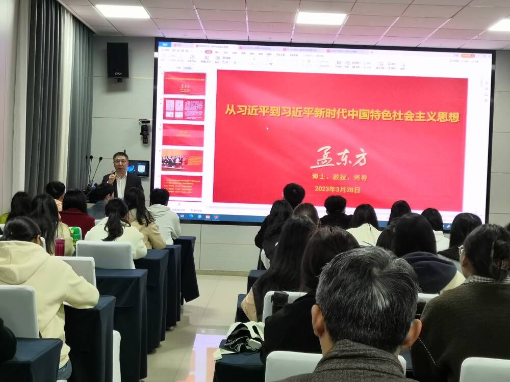 紧接着,孟东方教授围绕党的十九大报告、党的十九届六中全会公报、党的二十大报告以及《中国共产党章程》等内容,以“两个结合”“从‘两问’到‘四问’”等为关键词讲授了习近平新时代中国特色社会主义思想的主要内容。