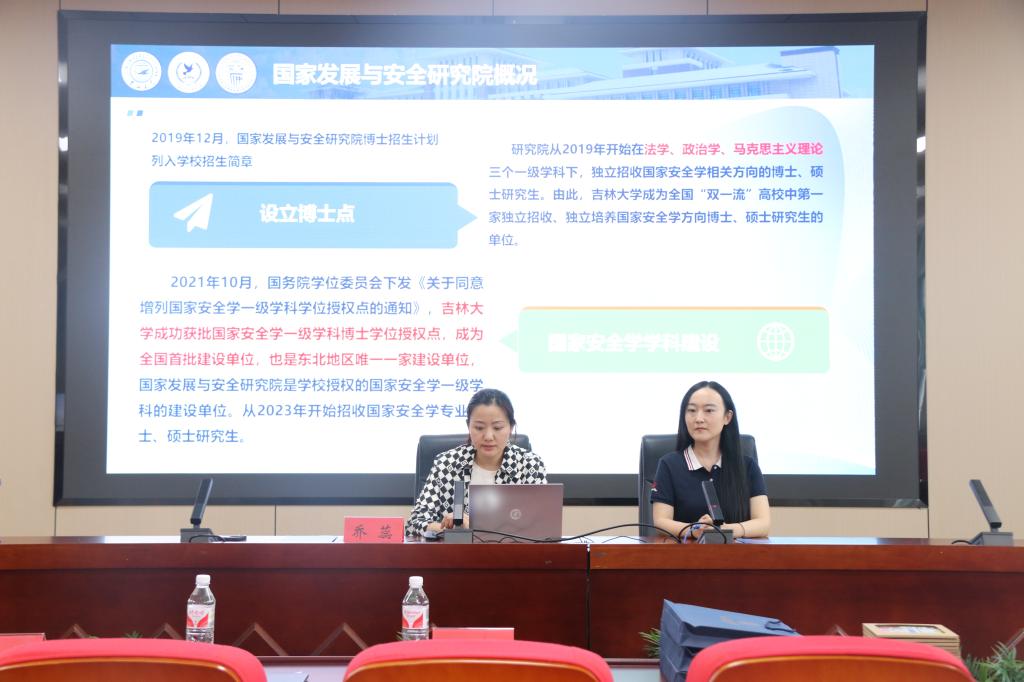 、学科建设、师资队伍、人才培养、科研成果、学术活动等内容展开招生宣讲。其中,她着重介绍了其学院在人才培养方面的特色活动,如国家安全学院长论坛、国家安全学研究生学科交叉融合论坛、模拟外交谈判系列活动等创意学术活动。她表示,其学院致力于打造科研学术交流平台,以提升学生的学术能力及跨文化交流能力为重要任务,不断探索其在学科建设中的新思路、新方法、新模式。