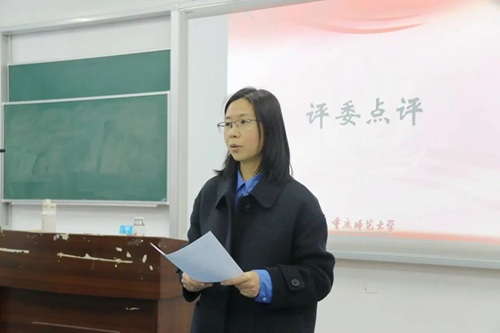 邵二辉老师首先高度肯定了各位选手在环节完整度、案例的选择、PPT的制作和教学仪态等方面的优秀表现,同时也提出建议:第一是教学案例要服务于知识点,强化知识点的讲解并注意案例与课堂主题的相配性;第二是说课内容要合理取舍,不要过于冗杂;第三是要合理的利用AI赋能教学,优化教学策略;第四是要重视细节问题,如PPT字号的大小和清晰度等。