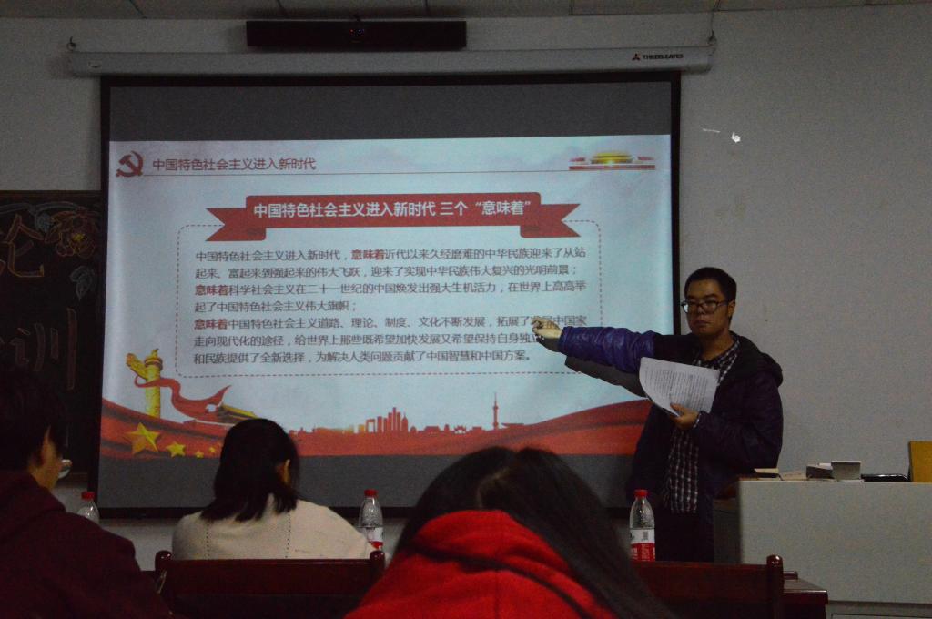 肖源对党的十九大报告进行了解读。涉及到中国特色社会主义进入新时代的三个“意味着”,一个历史使命与“四个伟大”,并阐述了新时代新的主要矛盾。随后重点讲解国家提高保障和改善民生水平,加强社会治理,加快生态文明建设,建设美丽中国的奋斗目标。