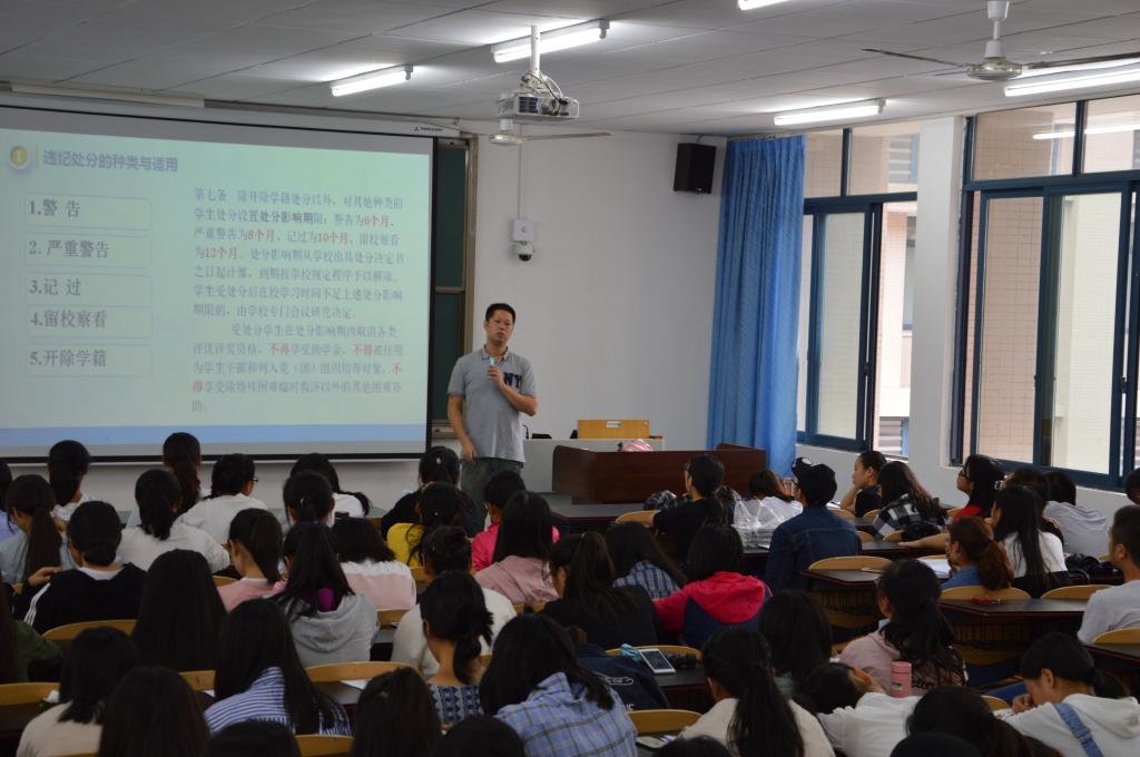 新生入学教育中的一项重要内容,开展此次讲座不仅有利于大学生更好的认识校纪校规,将校纪校规牢记心中,也有利于营造良好的校园环境,构建和谐校园。