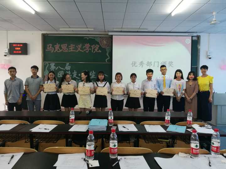 校歌,大会拉开序幕。首先进入部长述职演讲环节。理调部、学习部等12位各部门部长依次上台进行述职。各部长分别从认识部门、回顾部门动态以及部门规划等方面进行了阐述。接下来进入优秀部门颁奖环节。本着公平公正公开的原则,最终理调部、学习部、实践部、文娱部、组织部、新媒体部、生活部、社团部等8个部门荣获优秀部门奖。