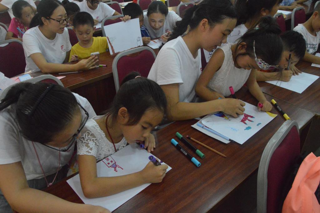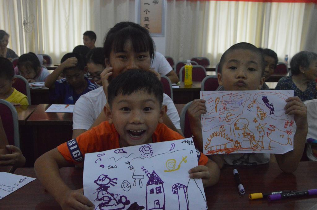 第二个环节是绘画指导,志愿者们为每一个到场的孩子都准备了画笔和画纸,让他们画出自己的童话世界。小朋友们以丰富的想象力画出了各种各样的图画,有房子、太阳、汽车、公主等,充满童真趣味。志愿者看到有个小朋友画了一个头上只有四根头发的人很好奇:“小朋友,你这是画的什么呀?”小朋友骄傲的回答道:“这是我的‘四毛’。”志愿者又问道:“如果只有三根头发,那又是什么?”小朋友说:“那就是‘三毛’呀。”志愿者就继续发问:“如果没有头发,那是什么呢?”小朋友天真的回答道:“那就是光头强啊。”现场人员被逗得哈哈大笑,气氛十分热烈。