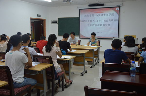 经前期会议讨论,此次暑期三下乡的活动地点是重庆万州等5个区县。会议伊始,陈钢老师带领大家详细分析了此次暑期三下乡的项目,并着重对“学习”宣讲团、“四个全面”观察团、美丽中国实践团三个项目做重点解析。接着,陈老师为同学们进行了专业性的课题指导,鼓励同学们围绕全面小康建设、依法治库、党组织开展“三严三实”的学习情况三个方面准备课题。随后,马老师就此次暑假实践活动的有关事项向同学们做了相关补充,强调了实践的任务与要求,鼓励同学们团结互助,以饱满的精神、求真务实的态度将社会调研落   到实处。最后,老师为同学们答疑解惑,同学们提出自身存在的疑问,两位老师耐心、细致作答。