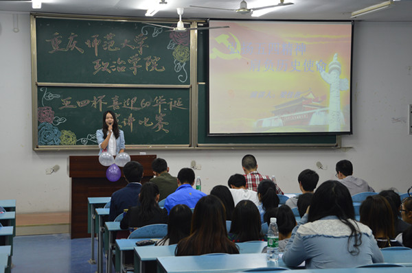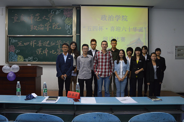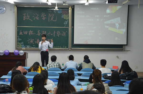 于2014年5月9日晚7点半组织2011级、2012级、2013级全体学生在弘德楼5202和5302开展了以“五四杯·喜迎六十华诞”为主题的演讲比赛。出席本次比赛的评委有校学生会主席任毅、校自律委主任贺青伟、校91自拍论坛学生主任侯超文、校91自拍论坛广播台播音员尚佶、王磊以及91自拍论坛