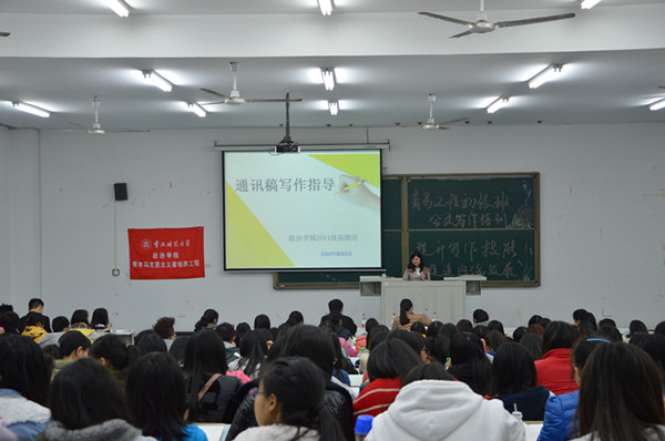 “青马工程”初级班“提升写作技能 促进内涵发展”公文写作培训讲座在图北楼7101教室举行。政治学院团总支·学生会理调部部长2011级高源洁、2011级敖阳利,组织部副部长2012级徐梓凌担任主讲人。第五期“青马工程”学员、2013级全体同学参与。