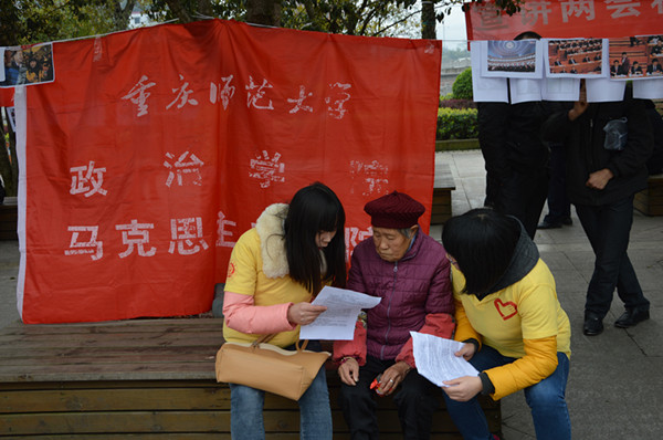 下午两点半,志愿者们乘坐公交车到达学府广场,设点展示和发放活动图片资料,并安排人员进行介绍。活动分为“聚焦两会胸怀使命”两会政策宣讲和“惠民普法”法律常识咨询两大板块:第一板块中,志愿者们有针对性的选取两会中最新惠民政策,如“更加重视人的城镇化”、“完善社保体系”、“收入分配改革再发力”在社区进行宣讲和解读,使得居民能够更好了解当前政策的便民性、惠民性。第二板块中,志愿者们宣传的法律知识重点选择在易发生在居民生活的法律误区,通过实例形象生动的向社区居民解读法律常识,使他们更好的了解法律。社区居民们也热情地与志愿者们进行交流沟通。下午五点,志愿者们与当地居民留影纪念,社区志愿服务活动圆满结束。