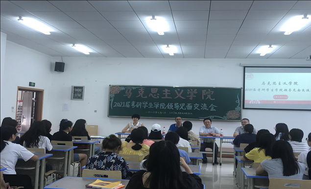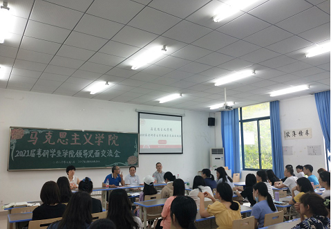 2021届考研学子进入了紧张备考阶段。为激发学生的奋斗热情,营造比学赶帮的学习氛围,积极调节学生身心状态, 2020年7月8日15:00,学院于汇贤楼X106教室举行了2021届考研学生学院领导见面交流会,为备考学生加油鼓劲。此次交流会由2017级辅导员马小又老师主持,党委书记刘军、院长陈洪以及党委副书记方敏出席活动并作分享交流。