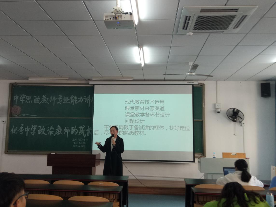 本次讲座,让同学们从任老师的亲身实践中认识到一名优秀思政教师的成长,有利于坚定同学们的理想信念、明确实践方法。有利于深入一线课堂,明了在实习期间的成长目标,增强师范生技能训练,从而成为一名优秀的政治教师。