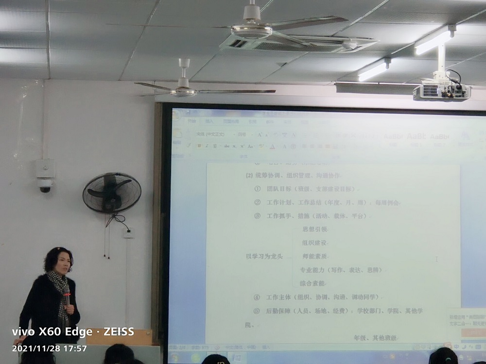 于励志楼12410教室为2021级新生做以“学生干部能力素质与服务意识培训”为主题的指导讲座。本次讲座由学院团委书记,2021级辅导员马小又老师担任主讲人。2021级全体同学认真聆听,虚心学习。