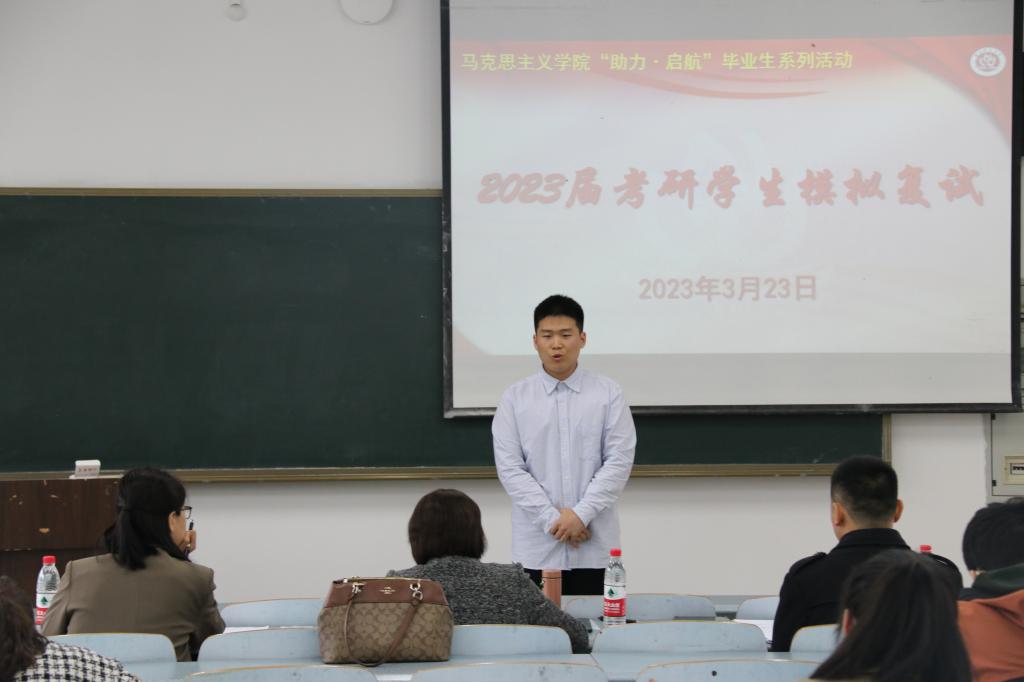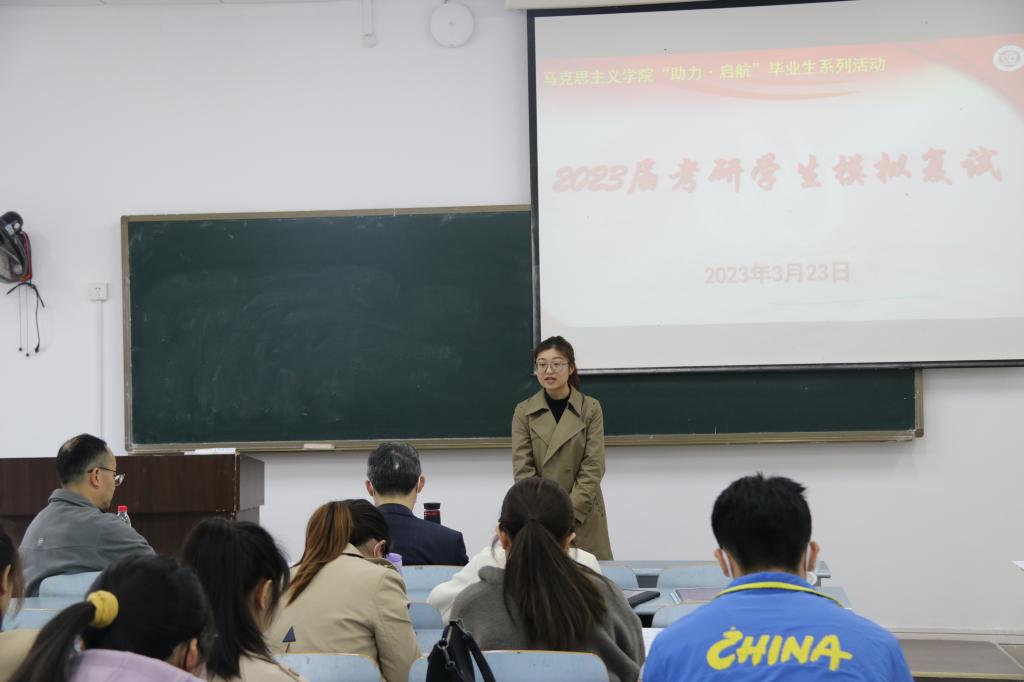 于弘德楼12501、12502等教室开展2023届考研复试模拟面试。此次考研模拟复试特邀学院18位经验丰富的专业学科教师担任模拟面试官,共计56位考研学子参与。