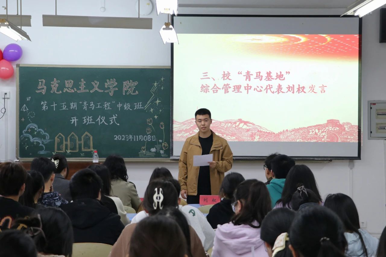 仪式第三项,校团委青马基地主任刘权发言。刘权代表学校“青马基地”综合管理中心对91自拍论坛