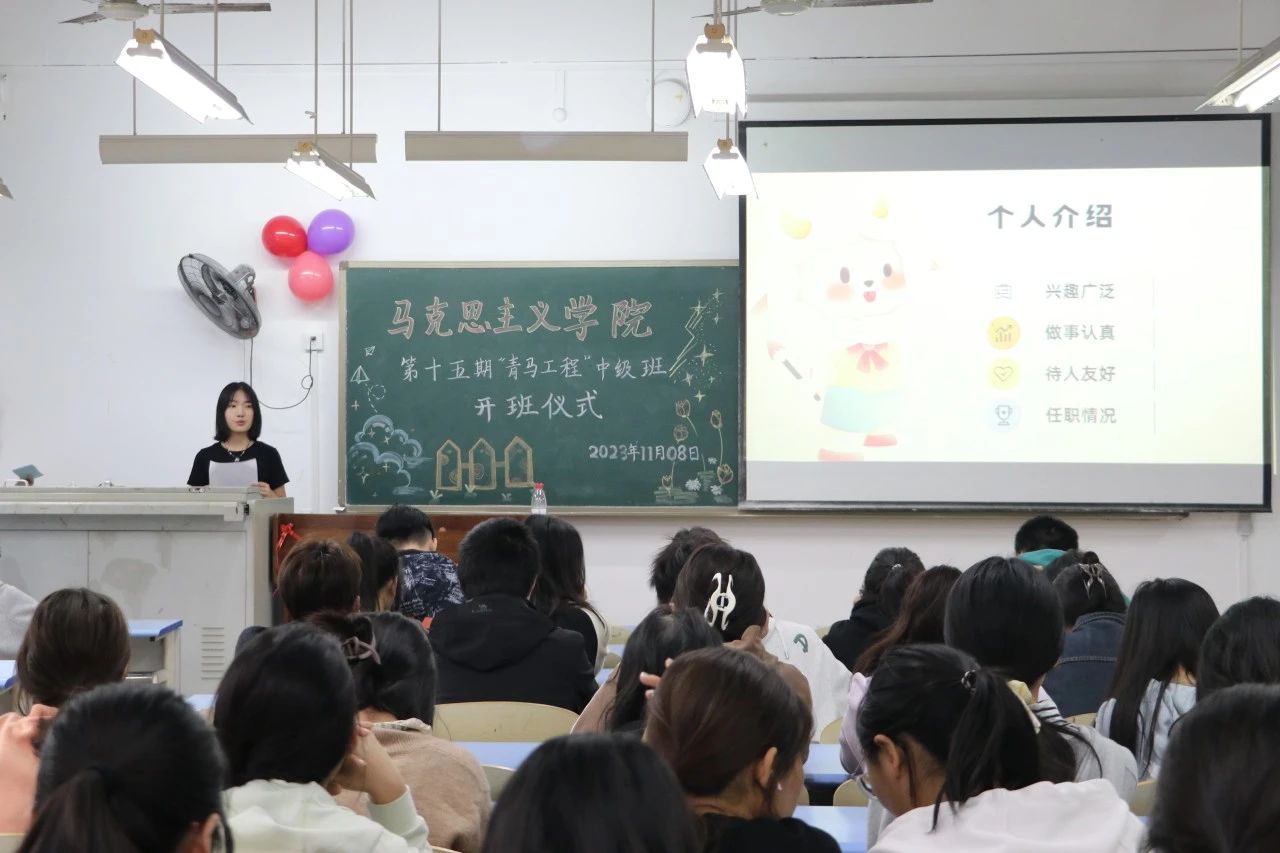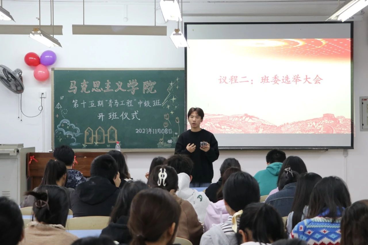 第十五期“青马工程”中级班开班仪式暨班委选举大会于弘德楼13201教室顺利举行,学院分团委书记兼学工办主任刘洪,校团委青马基地主任刘权,院“青马工程”主要负责人、院学生会执行主席黄丽娅,院学生会主席团成员柴星宇出席本次仪式。