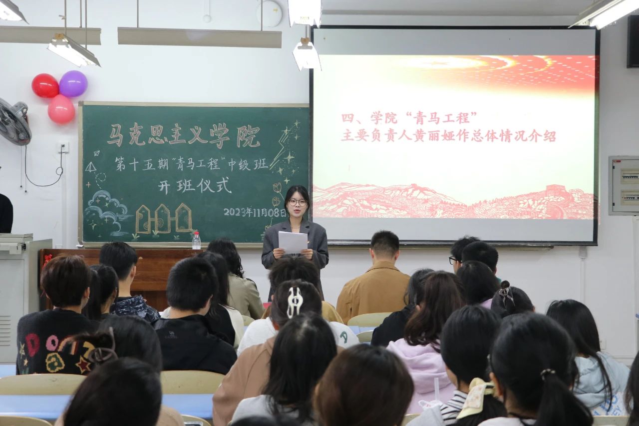 仪式第二项,院分团委书记刘洪宣读关于第十五期“青马工程”中级班开班决定。刘洪老师指出必须培养一批信念坚定、能力突出、与时俱进的青年马克思主义者,希望全体同学们锐意进取、刻苦学习,努力做到自信自强、守正创新、踔厉奋发、勇毅前行,为成为一名中国特色社会主义合格建设者和可靠接班人不懈奋斗。