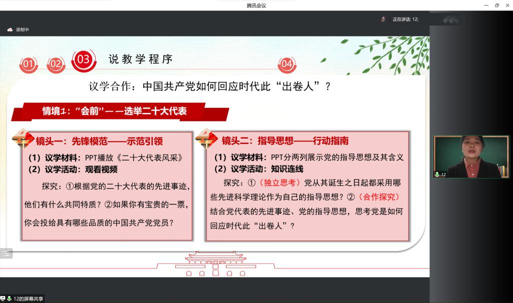 郑瑜老师对选手们在说课中展现出的亮点进行了充分肯定并针对说课教学提出五点建议:一是突出教学目标,以一节课为整体进行教学设计,以系统的形式进行总结升华;二是教学设计与教学教点、时政、教育改革热点相结合,善用议题式教学,一案到底、条理清晰;三是突出课件的直观性,课件要制作精美,图文并存且导航清晰;四是关注课题后的意图,注重教学设计与教学方法;五是强调教学课题的总结与升华,积极进行教学反思,达到教学目标。